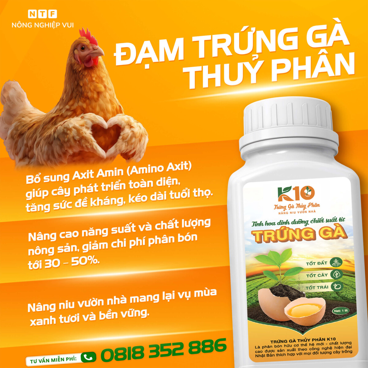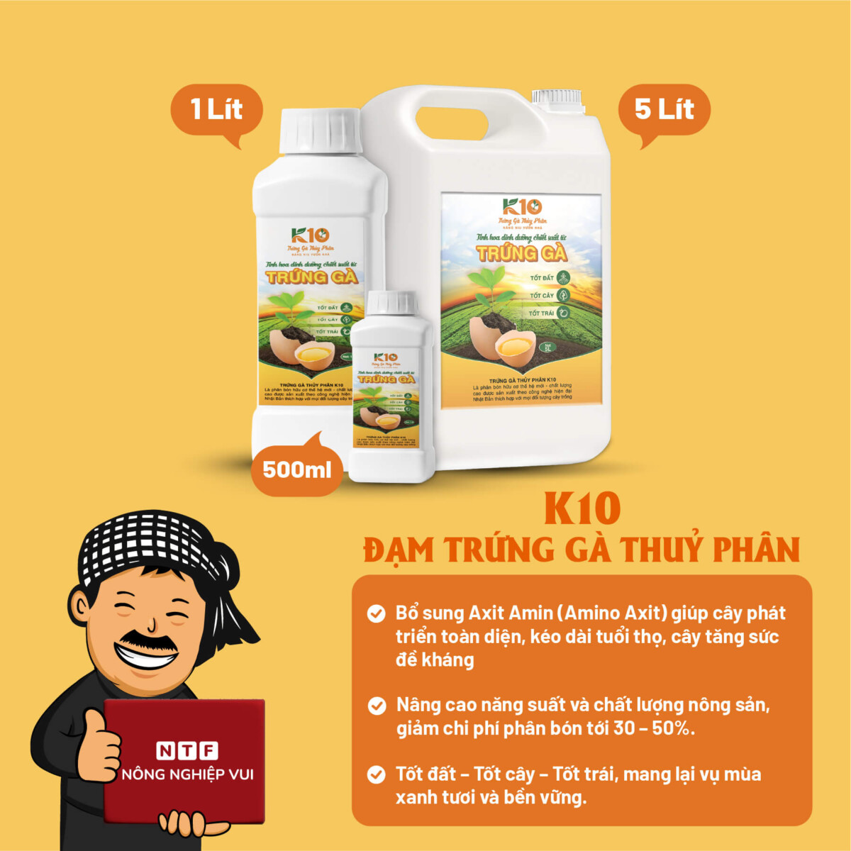 K10 là phân bón hữu cơ thế hệ mới, được sản xuất theo công nghệ thủy phân trứng gà hiện đại từ Nhật Bản.